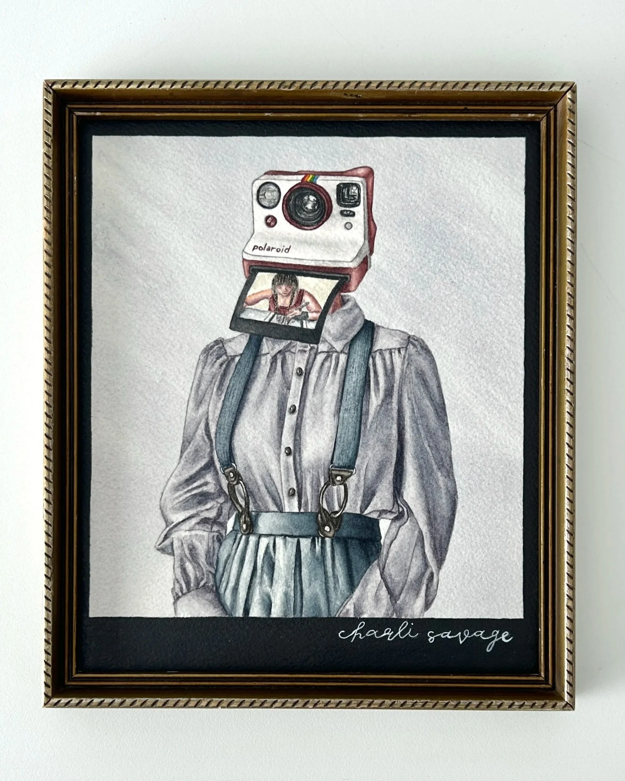 This piece pays homage to my photography days and the way memories are captured, framed, and preserved. Inspired by nostalgia and my time behind the camera, the Polaroid becomes both a head and a window into the past. The image being ejected from the camera is a photograph of me painting this very piece. It brings together who I was as a photographer and who I am now as a painter / sculptor, holding past and present in the same frame, much like a Polaroid that slowly reveals its story.